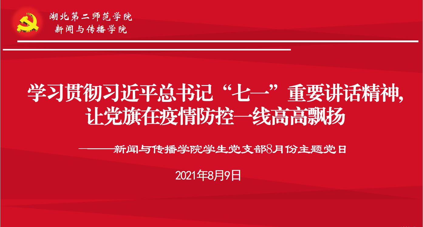 本网讯(院新闻中心记者 赵逸飞)8月9日,新闻与传播学院学生党支部以线上会议的形式召开8月支部主题党日活动。本次党日活动以学习贯彻习近平总书记“七一”重要讲话精神,让党旗在疫情防控一线高高飘扬为主题。新闻与传播学院学生党支部全体成员参加,学生党支部书记孟黎明同志主持活动。