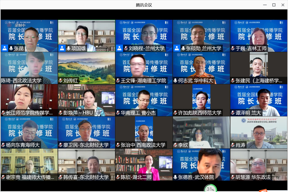 研修阶段包括专家授课和分组研讨两个环节。在专家授课环节,中国人民大学副校长胡百精、中国传媒大学原副校长丁俊杰、中国新闻传播教育年鉴编撰委员会主任张昆、兰州大学新闻与传播学院院长冯诚、中国人民大学新闻学院执行院长周勇、武汉大学新闻与传播学院院长强月新、中国教育电视台总编辑胡正荣、复旦大学新闻学院执行院长兼党委书记张涛甫、暨南大学党委书记林如鹏、中国传媒大学新闻学院院长隋岩教授等专家进行了高水平的报告分享。在分组研讨环节,专家学者们汇聚线下“云”上,围绕新闻传播学院的共性问题及各自特色进行了分享和探讨。