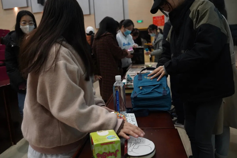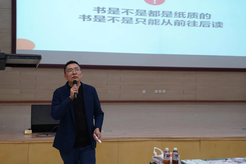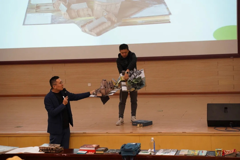 讲座上被展示的第一本书,是一本通过触觉阅读的温变图书。刘嘉鹏老师带着书走下讲台,亲切地让同学们一一触摸。“这本书,必须是放在零下10℃去阅读,当超过了20℃,它会发生一些变化。至于发生了什么变化,我们看看分享会结束后它会变成什么样子。”刘嘉鹏老师为观众留了一个悬念。
