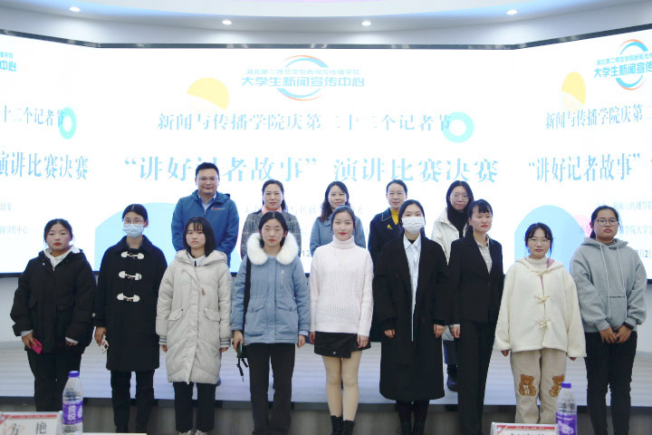 本网讯(院新闻中心见习记者 喻梓欣)12月2日晚18:00,新闻与传播学院大学生新闻宣传中心(以下简称新闻宣传中心)在一号楼七楼多媒体教室举办2021庆第二十二个记者节——第一届“讲好记者故事”演讲比赛决赛。新闻与传播学院新闻系主任、教师党支部“双带头人”工作室主持人赵晓芳老师,广告学专业负责人、学生成长工作室主持人方艳老师,编辑出版学专业负责人、学生成长工作室主持人江锦年老师,分团委书记孟黎明老师,新闻宣传中心总监梁芷璐老师担任此次比赛的评委。此次比赛由新闻宣传中心负责人姜利均主持。