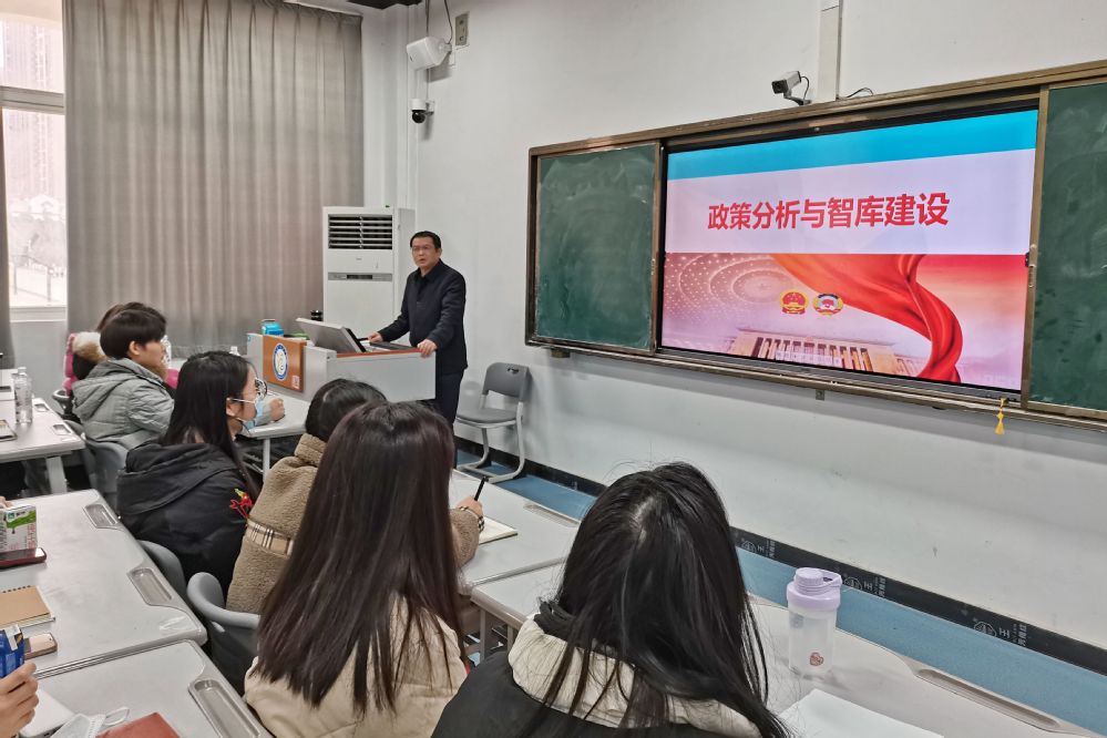 在这堂政策分析与智库建设专题课程上,郑军以“规划”入题,从“‘十四五’国家应急体系规划”延展到个人的职业、求学规划,从“实现中华民族伟大复兴的中国梦”、“中国共产党奋斗史”“五年规划的背景由来、历史进程、特点意义”等方面聚集党和国家辉煌成就和伟大征程,讲述“学党史、知党情、强党性、跟党走”的重大意义,并以“两个一百年、两步走发展战略、四个全面、五位一体、七大战略、科教兴国”作为关键词,引导同学们深刻领会把握党的“十四五”规划的核心要义。