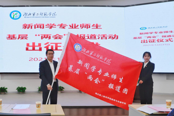 本网讯(通讯员 杨雯 记者 刘欣然)2022年1月,新闻与传播学院(以下简称“新传学院”)师生“两会”报道团正式出征,校长郑军在出征仪式上为代表团授旗,随后,师生代表团前往武汉洪山区及荆州、随州、恩施等地参与基层两会新闻报道,在此期间学生署名发表相关稿件30余篇,为当地新闻宣传报道增添了一抹亮色,取得良好成果,获得地方广泛好评。