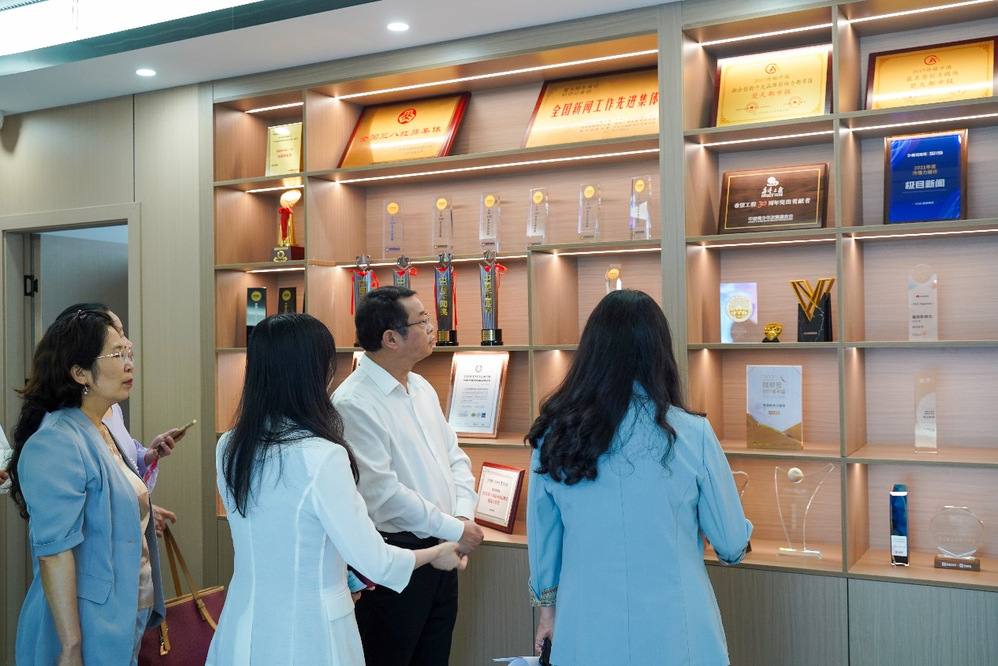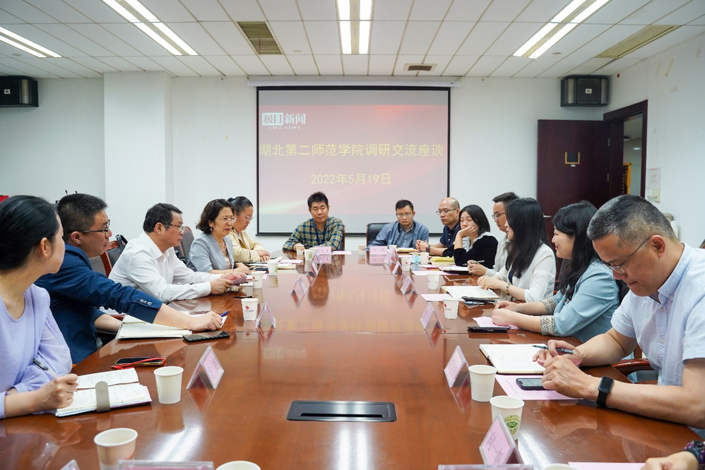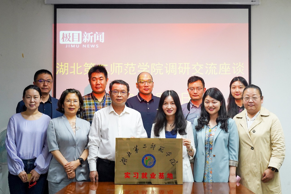 郑军一行参观楚天都市报·极目新闻办公区、融媒体中心,听取相关负责人介绍。随后,校企双方开展“湖北第二师范学院调研交流座谈会”并举行“湖北第二师范学院实习就业基地”挂牌仪式。湖北日报传媒集团党委委员、副总编辑、楚天都市报·极目新闻总编辑周芳,楚天都市报·极目新闻副总编辑罗欣及部分二师校友、楚天都市报·极目新闻记者参加座谈。