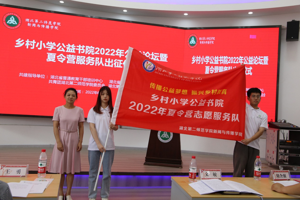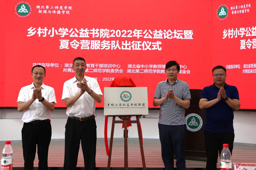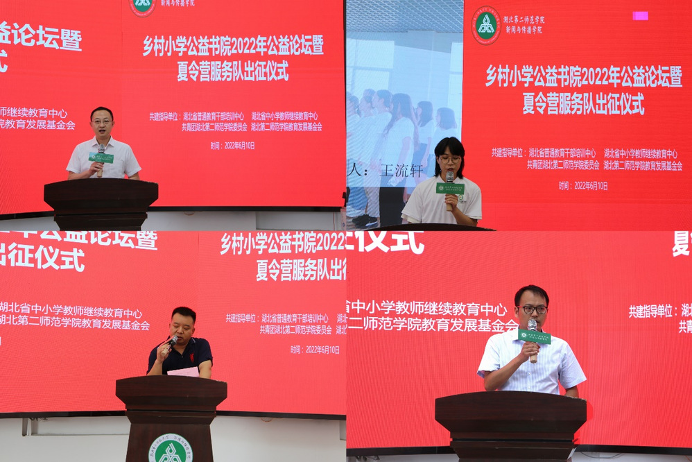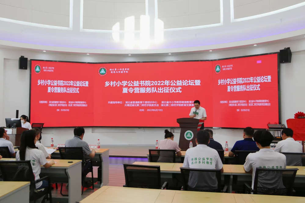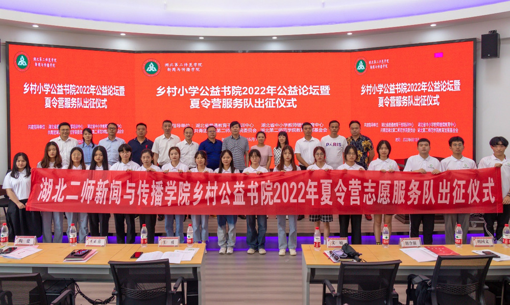 本网讯(院新闻宣传中心记者 杨钰康)6月10日下午,新闻与传播学院(以下简称“新传院”)于一号楼圆顶多功能厅举行主题为“传播公益梦想,振兴乡村教育再出发”的乡村小学公益书院2022年公益论坛暨夏令营服务队出征仪式。湖北第二师范学院共建指导单位领导、爱心企业合伙人、新闻业界合伙人、联盟学校合伙人以及志愿者参加仪式。仪式由新传院团委书记、书院项目办主任孟黎明主持。