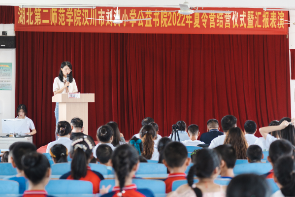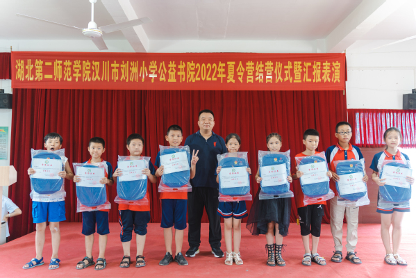 本网讯(通讯员 杨钰康)7月19日上午,新闻与传播学院(以下简称“新传院”)举行汉川市刘洲小学公益书院2022年夏令营结营仪式暨汇报表演。武汉竹江世家家具有限公司总经理刘含强,新传院党总支副书记邱媛,学工办主任、团委书记孟黎明,资助中心主任张帆,汉川市沉湖镇刘洲小学校长段海涛、后勤主任曾志刚、办公室主任谭超,夏令营全体志愿者老师及学员参加此次活动。新传院团委副书记王一主持结营仪式。