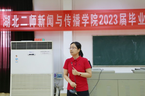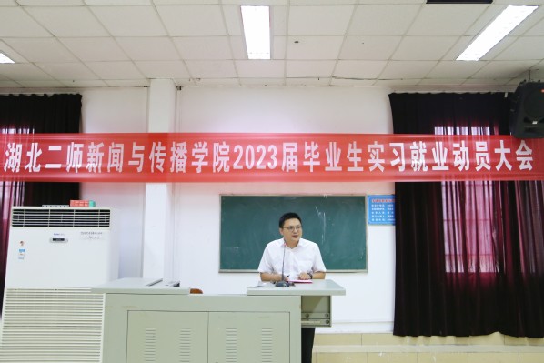 本网讯(通讯员 王玙)9月22日下午,新闻与传播学院(以下简称“新传院”)在老图书馆二号报告厅召开2023届毕业生实习就业动员大会。湖北省广播电视台教育频道(以下简称“湖北广电”)“精英讲师团”,新传院党总支副书记邱媛、副院长陈欣、全体毕业班辅导员及毕业生出席会议。会议由学工办主任孟黎明主持。