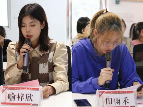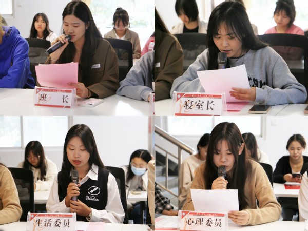 22级新闻1班班长葛怡嘉、广告2班511寝室长冯可、新闻2班生活委员曾敏、广告1班心理委员袁文珍作为学生代表依次发言。