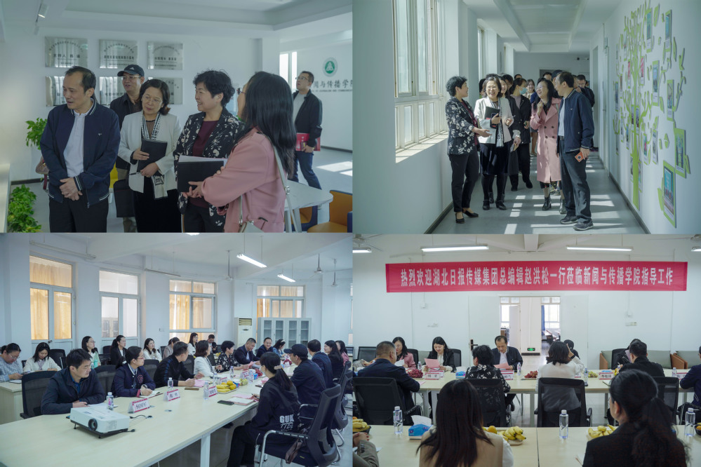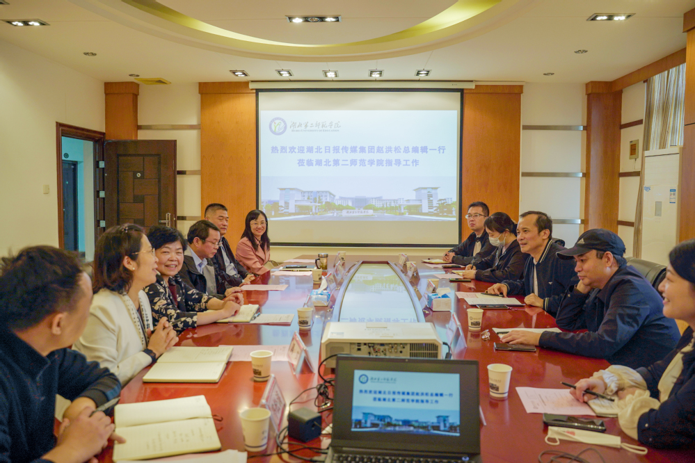 杨鲜兰对湖北日报传媒集团的到来表示热烈欢迎,感谢其一直以来对学校工作的关心和支持,赵洪松对我校校园环境和对新闻人才的培养表示肯定。陈瑛表示:“希望能够通过产业化的教学模式将我校新闻学专业建设得更好。”双方对我校新闻学专业建设概况进行深入交流,达成共识:新闻理论教学和实践应高度结合,培养新闻工作者的实战能力创新思维是关键。