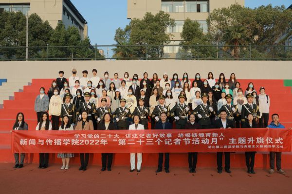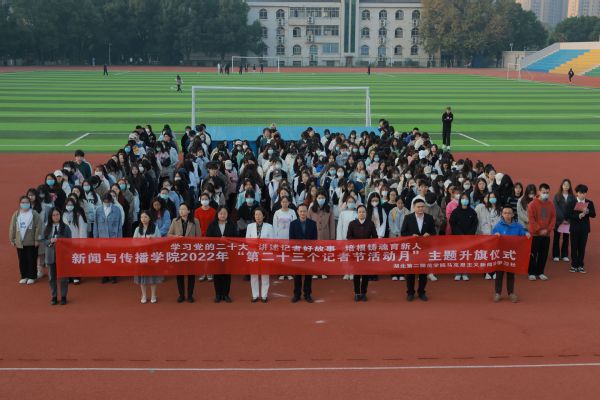 本网讯(通讯员 程江宇)11月7日上午,恰逢记者节来临之际,新闻与传播学院(以下简称“新传院”)在校综合运动场举行“学习党的二十大 讲述记者好故事 培根铸魂育新人”2022年“第二十三个记者节活动月”主题升旗仪式。新传院团委副书记王一主持仪式。