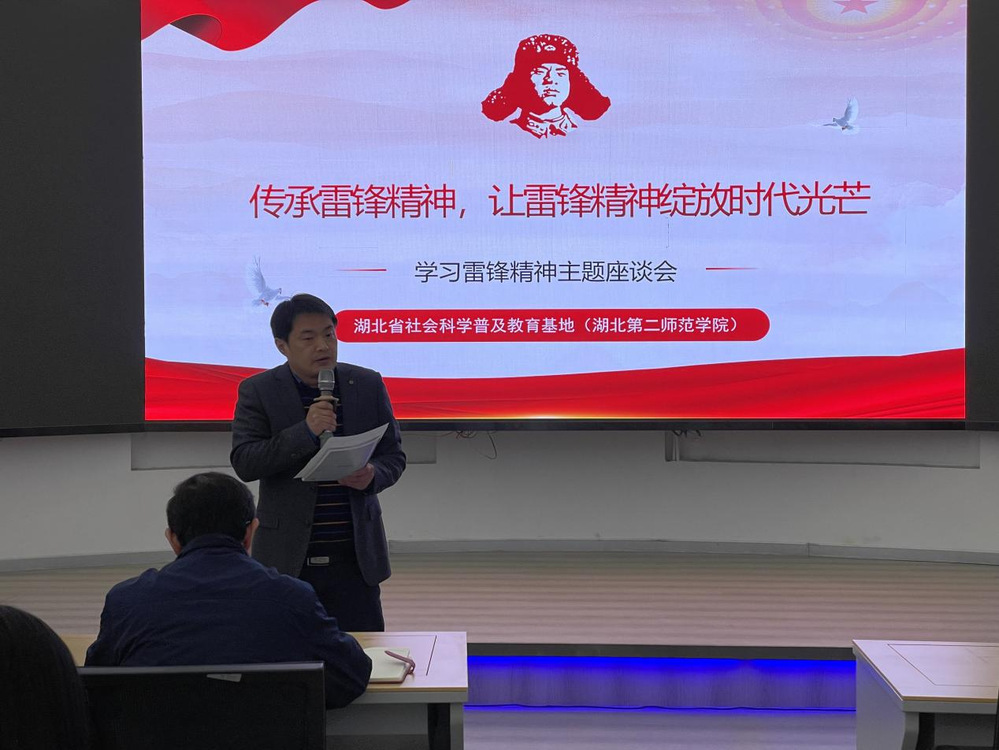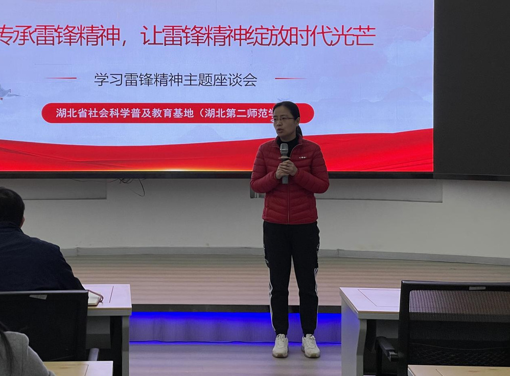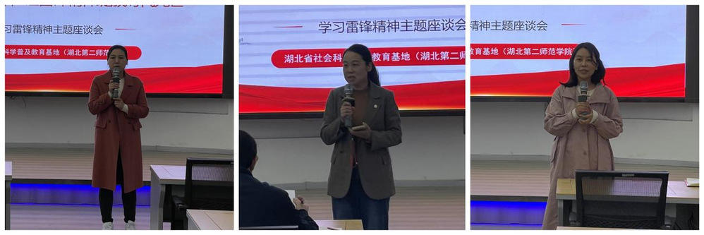 会后,湖北省社会科学普及教育基地(湖北第二师范学院)小组成员进行了学雷锋主题座谈会。大家围绕“传承雷锋精神,让雷锋精神绽放时代光芒”展开讨论发言,互相激励,并围绕课程特色用新新媒体技能制作宣传作品。刚刚进入团队的年轻老师肖楠说:新传学院老师们干劲大、节奏快,虽然有些苦累,但内心充盈!