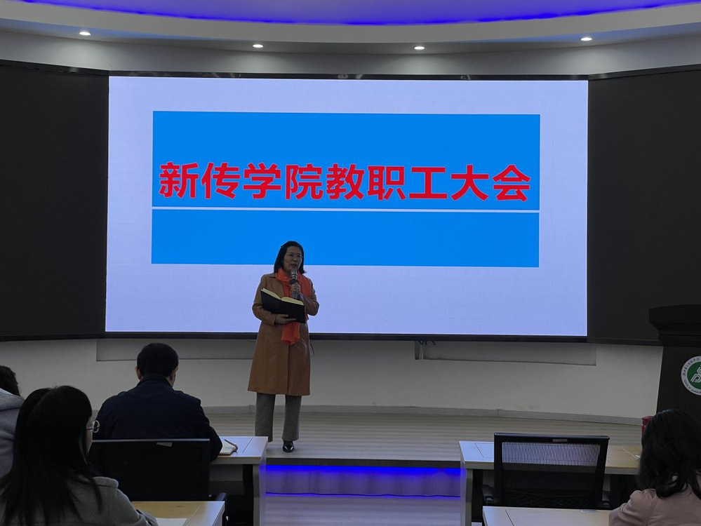 本网讯(通讯员肖南)3月16日下午2时30分至4时,新闻与传播学院在6楼1607 多功能报告厅召开教职工大会,会议由陈瑛院长主持召开,学院全体教职工参与。本次会议由学院领导班子徐晓、陈瑛、陈欣、何国军和各专业负责人分别以思想政治学习、学院工作部署、学院专业工作部署三个方面展开。