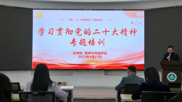 本网讯(院大学生新闻宣传中心记者 郭欣妍)为进一步深入学习贯彻党的二十大精神,不断提高学院干部队伍的党性修养和综合素质,4月27日下午,文学院、新闻与传播学院(以下简称“新传院”)于一号楼1607多功能厅联合开展“学习贯彻党的二十大精神”专题培训班开班仪式及第一场培训。两院相关党员干部、党员教师参加,新传院党总支书记徐晓主持仪式。