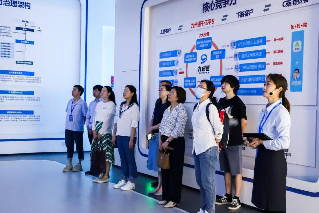 活动起始,由马力、易登峰带领大家参观九州通集团企业展厅,了解九州通医疗器械集团的主要发展历程及重要成果,九州通医疗器械集团持续推进“医药分销+物流配送+产品推广”的综合医疗服务模式,建设“大健康”服务平台。陈瑛表示,九州通“创新、赋能、共赢“的理念与新传学院“厚德立言、拓新融传”的院训不谋而合,通过后续深化“大健康+大传播”融合教育发展模式,共同为健康传播与健康事业发力,进一步打通企业和人才的供需链条,畅通我院新传学子提供实习实训就业渠道。
