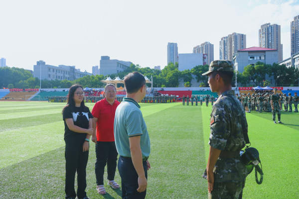 徐晓一行走进训练场,观看了学生们站军姿、走齐步、踢正步训练,并对所有同学这段时间以来的军训成果表示赞赏。与此同时,他对各位教官多日以来的悉心教导、辛勤付出表示感谢。