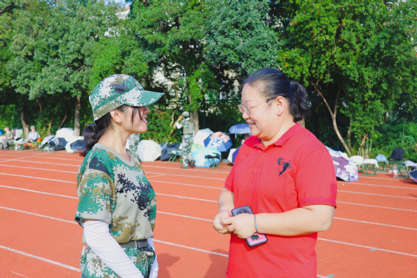 休息间隙,徐晓、邱媛、孙蓓与参训学生恳谈,询问新生近况及军训体验,看望了伤病同学,对学生的身体健康表达深切关心,并发放了预防中暑的药品,叮嘱同学们天气炎热,注意休养。