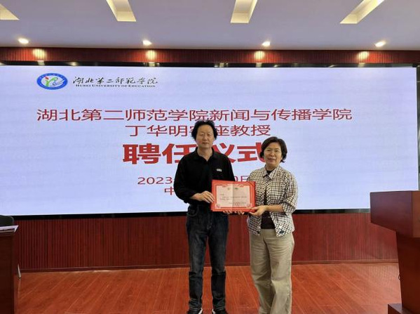 讲座伊始,新传院院长陈瑛介绍丁华明老师的工作事迹,并聘任丁华明为新传院客座教授,现场颁发聘书。