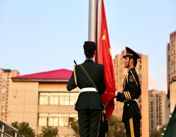 活动伊始,出旗,升国旗、唱国歌,全体师生行注目礼。