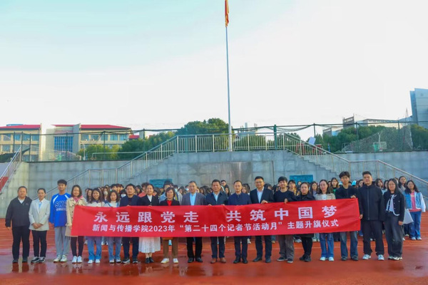 本网讯(大学生新闻宣传中心见习记者 谭晓莹)11月6日上午新闻与传播学院(以下简称“新传院”)于田径场举行新传院2023年第24个记者节“永远跟党走,共筑中国梦”主题升旗仪式。湖北第二师范学院期刊社社长郑诗锋、校区协调办公室主任杜锡彬、宣传部(新闻中心)副部长孟黎明以及新传院领导班子成员、教师代表、马新社全体成员、入党积极分子、新传院2022级及2023级全体同学参与。新传院学生工作办公室主任孙蓓主持。