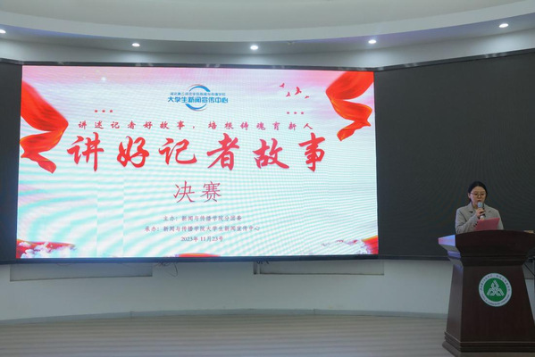 本网讯(大学生新闻宣传中心见习记者 许思洋)11月23日晚,新闻与传播学院(以下简称“新传院”)“讲述记者好故事,培根铸魂育新人“演讲比赛决赛于一号教学楼七楼多媒体教室顺利举行。本次比赛由新传院专任教师赵晓芳、李媛媛、李劲松老师担任评委。大学生新闻宣传中心主任彭炘怡主持。