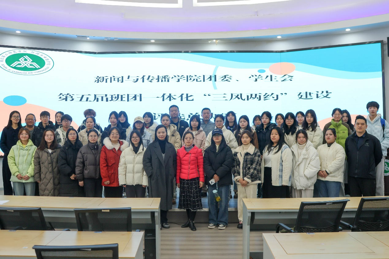 本网讯(大学生新闻宣传中心见习记者 秦媛媛)为夯实新闻与传播学院(以下简称“新传院”)班级寝室基层组织建设基础,积极培育和践行培养优良的学风班风寝风,营造书香氛围, 12月12日中午,新传院于1号教学楼七楼多功能厅成功举办第五届班团寝一体化“三风两约”决赛。新传院党总支副书记邱媛、学工办主任孙蓓、团委副书记王一、辅导员黄欢、教师王蔚岚、李劲松、胡亚婷、李芳芳担任评委,24级新闻学2班金渼珺主持,24级参赛选手及各班代表参加。