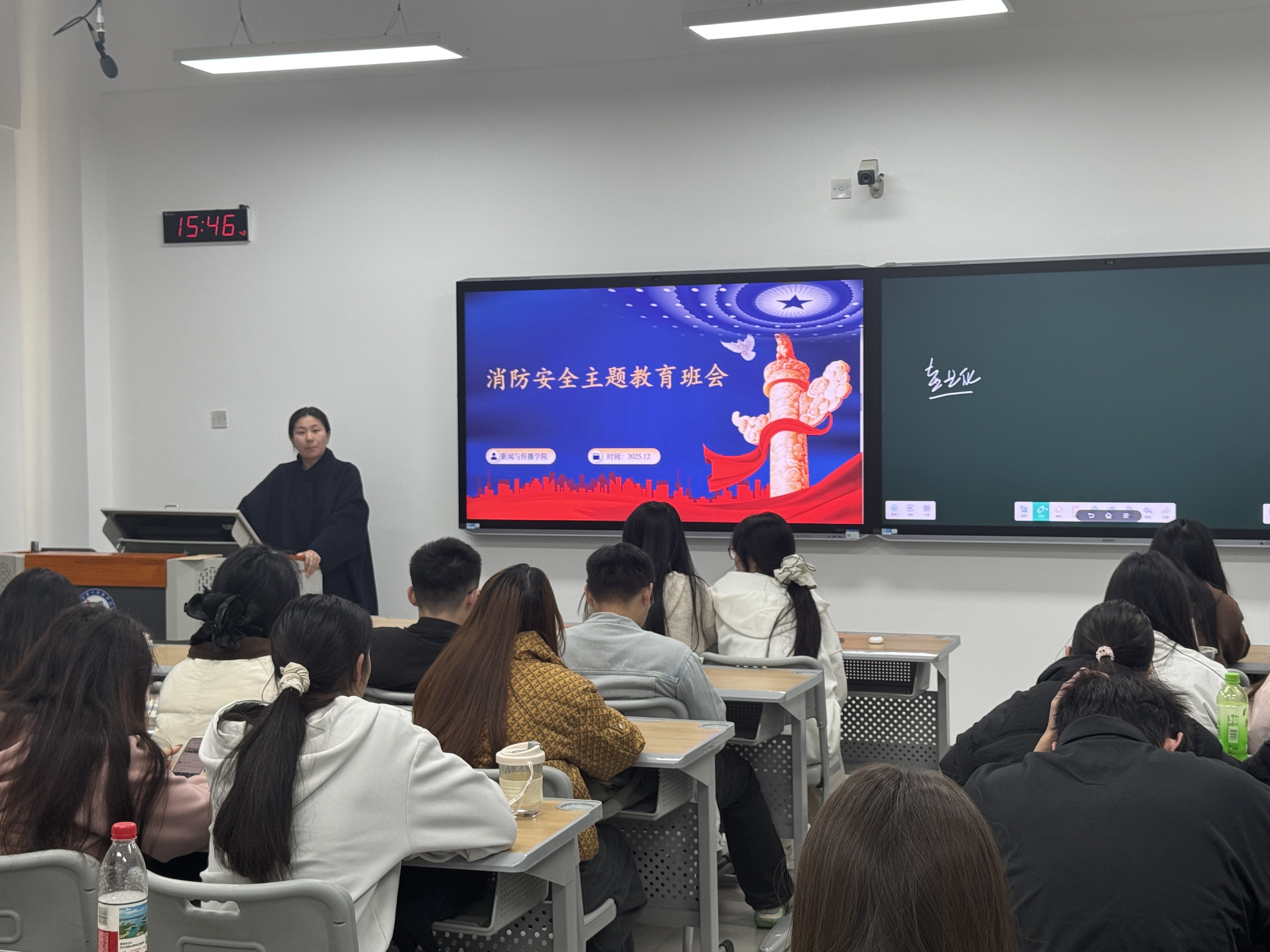 活动期间,新传院组织各班级分别召开安全教育主题班会,围绕消防安全与禁烟两大核心主题展开详细讲解。班会上首先结合宿舍生活中常见的用电隐患向大家普及规范用电、杜绝违规电器的重要性,着重强调 “人走断电、人离火灭” 的安全准则,提醒同学们时刻保持警惕,杜绝安全隐患。在禁烟教育环节,通过讲解吸烟对个人健康的损害以及在公共场所吸烟对他人造成的影响,引导学生树立“远离烟草、健康生活”的观念,自觉遵守校内禁烟规定。