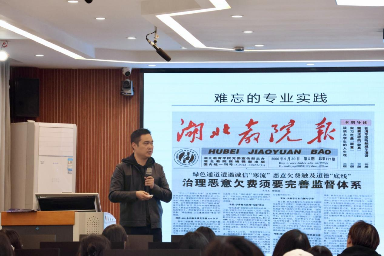 11月6日下午,新闻与传播学院(以下简称“新传院”)在一号教学楼六楼报告厅举办“新生看光谷”专题讲座。讲座由党总支副书记邱媛主持,2008届毕业生、盛隆电气集团董事邢文旭主讲,25级全体新闻学学生参加。