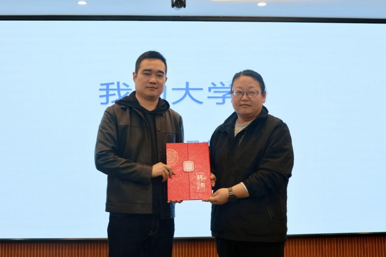 最后,邢文旭从三个“情怀”勉励在座的同学们:树立家国情怀,培养为国为民的意识;树立求真情怀,培养坚持实践的意识;树立创业情怀,培养自我营销的意识。邱媛为邢文旭颁发“大学生通讯社成长导师”聘书。