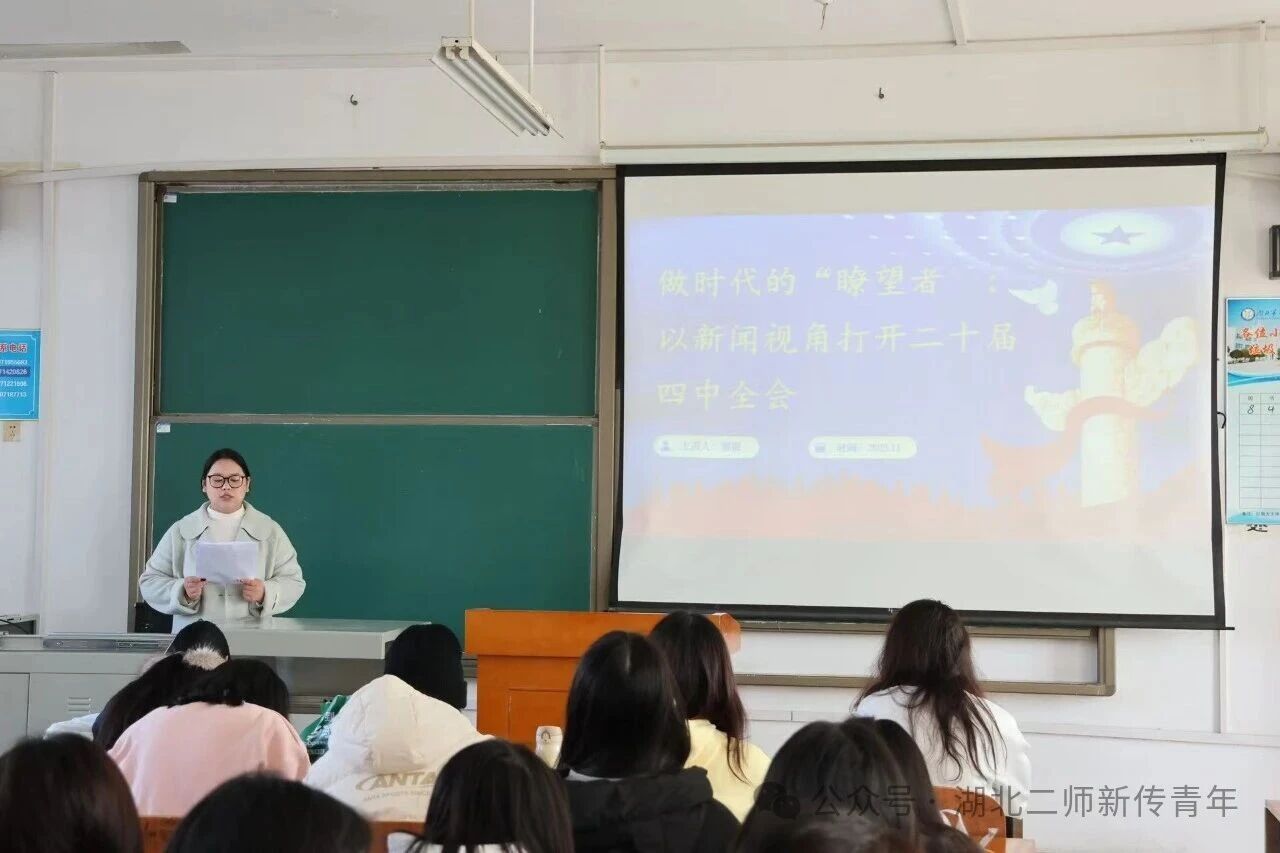 为深化对党的二十届四中全会的理解,以学科视角体悟全会精神,11月26日中午,新闻与传播学院围绕学习贯彻党的二十届四中全会精神开展研讨交流。此次交流会由湖北第二师范学院党的二十届四中全会精神青年宣讲团学生骨干窦苗主讲,23、24级全体入党积极分子参加。