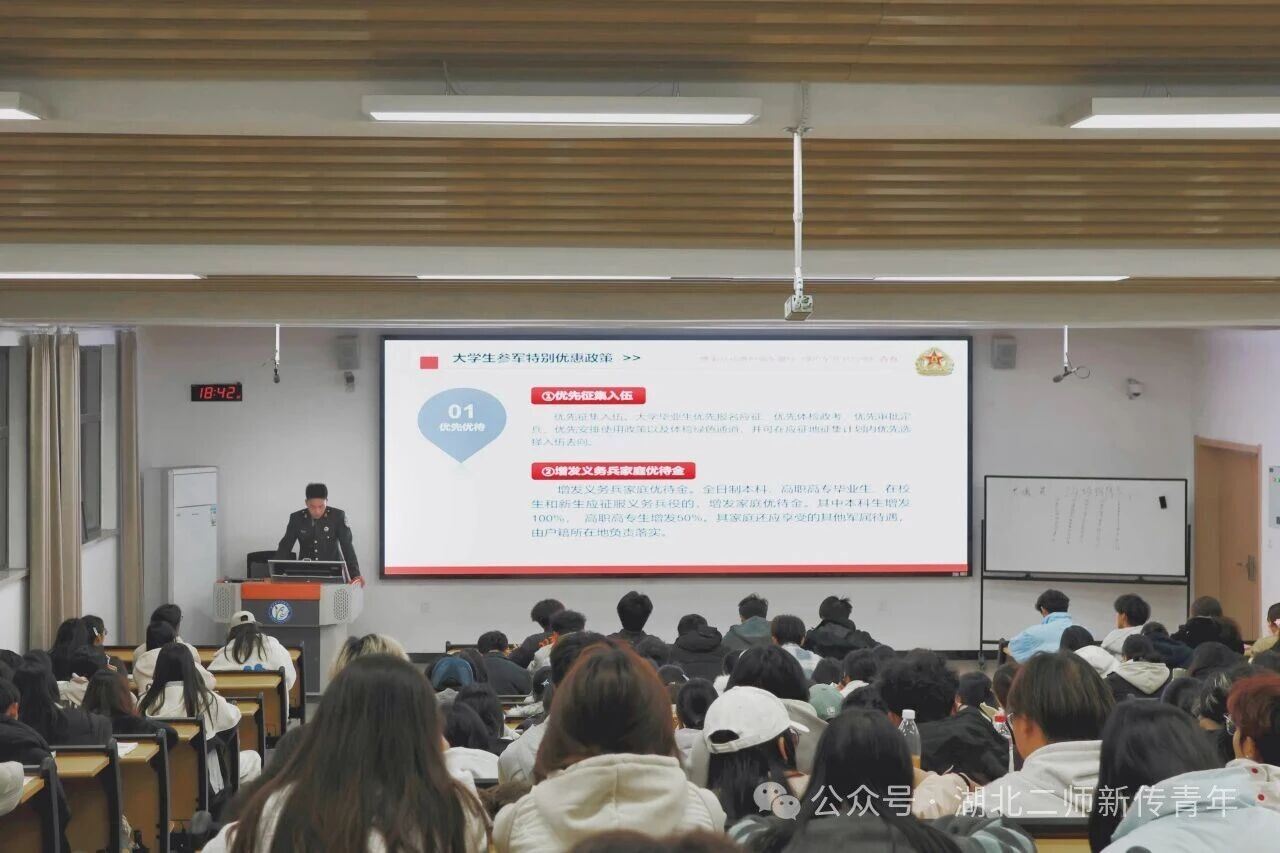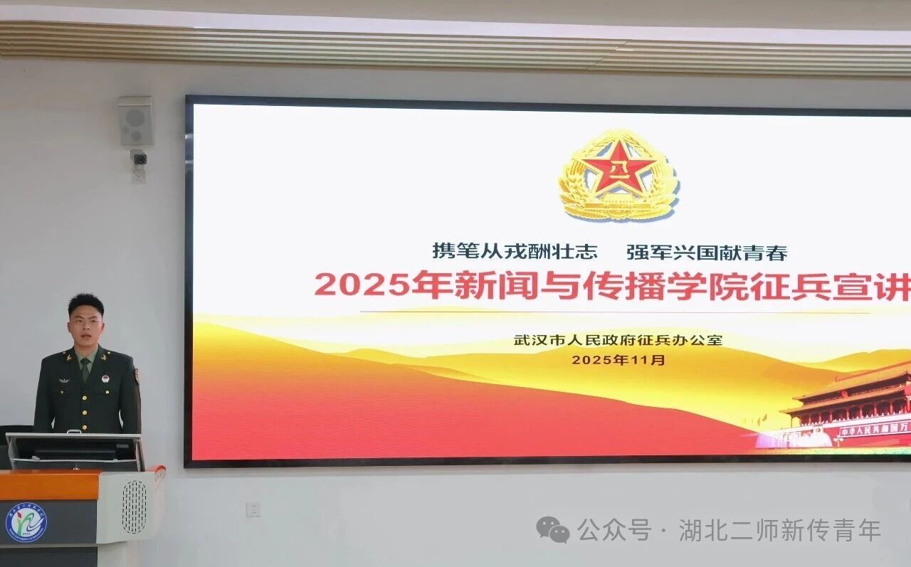 为积极响应国家征兵号召,激发青年学子参军报国的责任感与使命感,11月17日晚,新闻与传播学院(以下简称“新传院”)于博雅楼420开展征兵宣讲活动。本次活动由新传院辅导员黄欢主持,2025级新生参加。