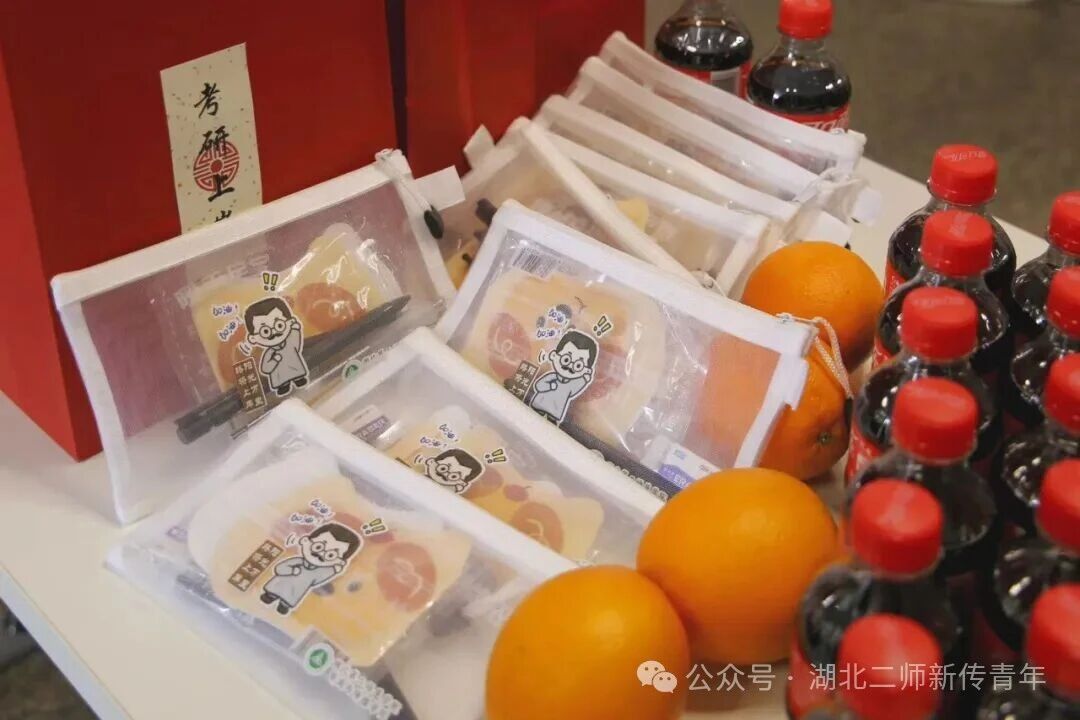 随后,老师们将一份份满载祝福的“考研上岸礼包”亲手送到同学们手中。礼包内既有文具等实用用品,寓意“妙笔生花”;也包含了带着“脐”开得胜、马到“橙”功等美好祝愿的暖心食品。收到礼包的同学们倍感惊喜与温暖,纷纷表示这份鼓励极大增强了他们的信心与动力。